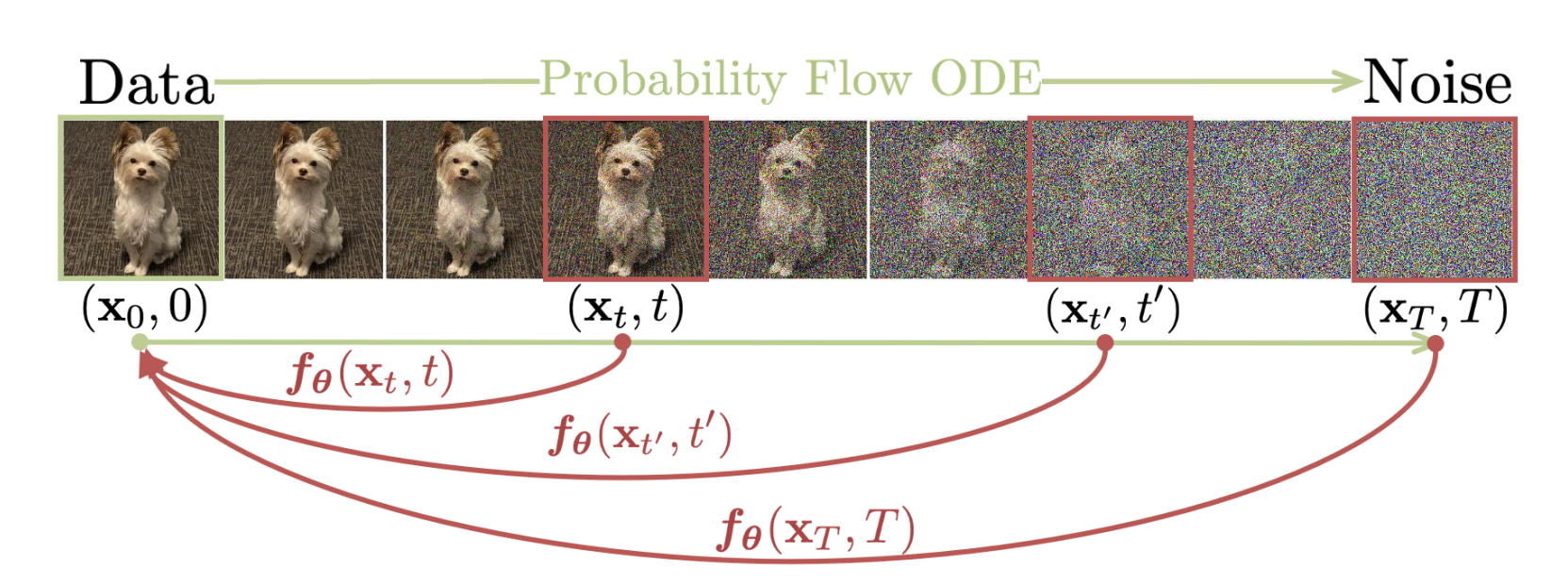 So, as you can see in the top part of the image we have an ODE that describes the change the image follows over time until it reaches the “pure noise state” (the “Probability Flow ODE arrow”). On the other hand, at the bottom, we have red arrows representing the “deinoising” ODEs from each point on the chain to the beginning (the “noiseless image”). As you see, the function that model this ODEs have a $\theta$ subscript, pointing us that they’ll be characterized by some kind of model.